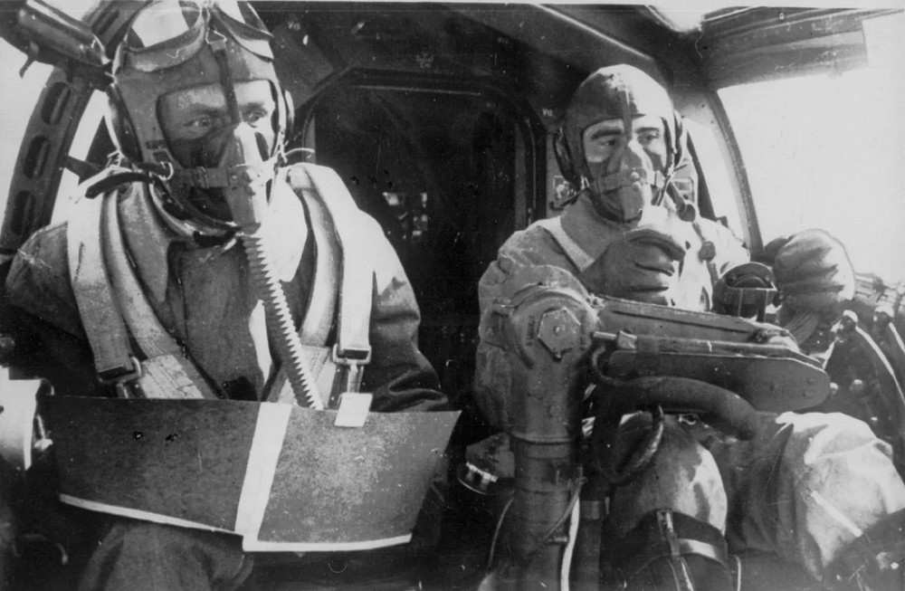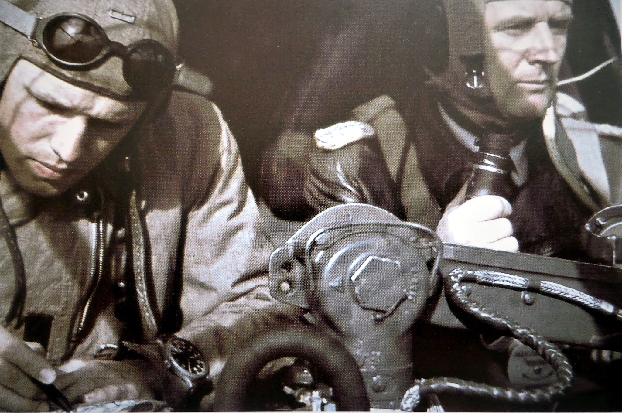 | De nouvelles vagues de bombardiers Allemands sont lancées sur les infrastructures Britanniques. Cet équipage porte les masques respiratoires, afin de voler à très haute altitude. Dans l'espoir de pouvoir échapper à la DCA . |
