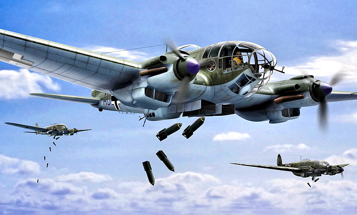 | Le navigateur continue imperturbablement sa tache de navigation, de mitrailleur et de bombardier sous le feu des chasseurs Anglais bien décidés à sauver leur pays. | |||||